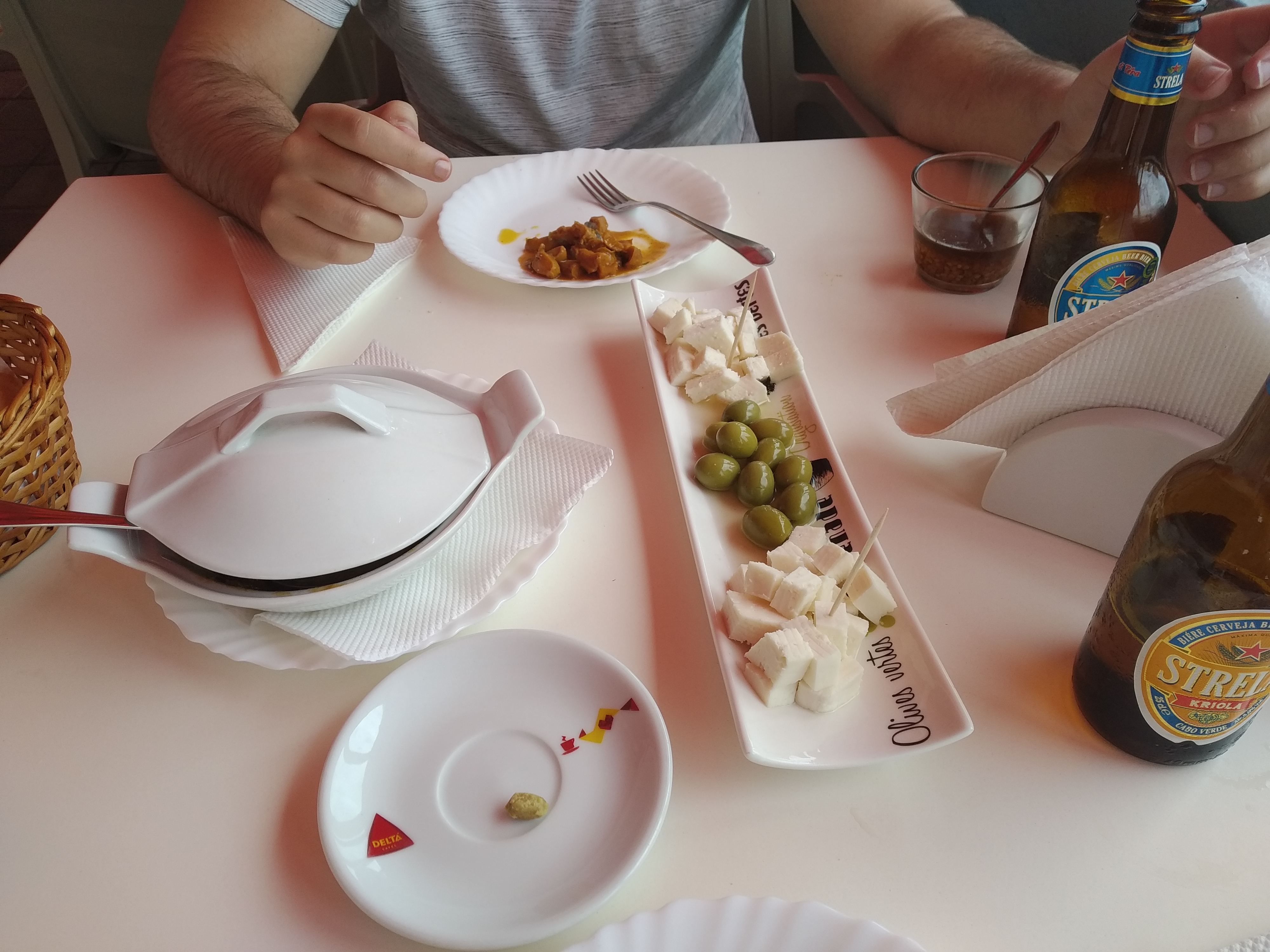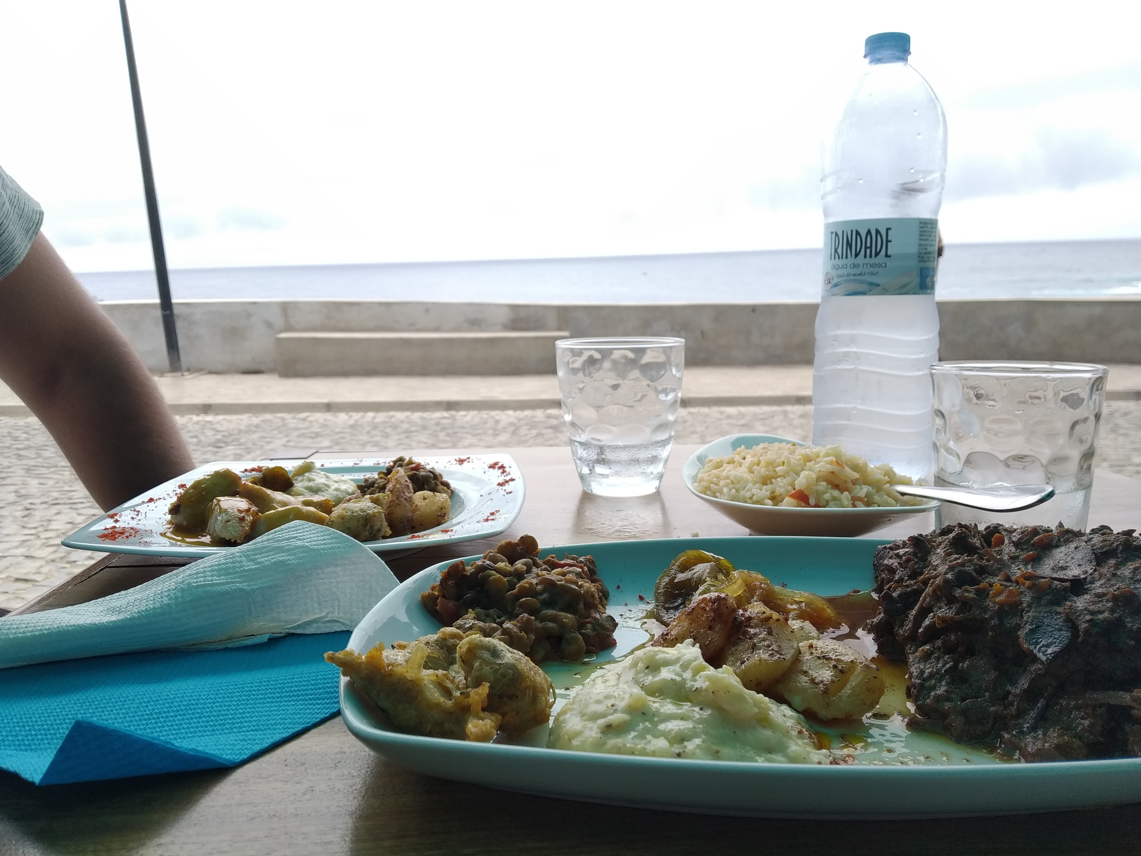 Nos tomamos unas cervezas Strela, marca por excelencia de Cabo Verde, unas olivas, queso de cabra de la zona y los famosos percebes…bueno nuestro gozo en un pozo…justo no había 😦 Así que probamos otro tipo de marisco, tipo calamares en una salsa tipo americana, pero del cual no nos hemos quedado con el nombre, espero que si vais tengáis más suerte con los percebes 😉